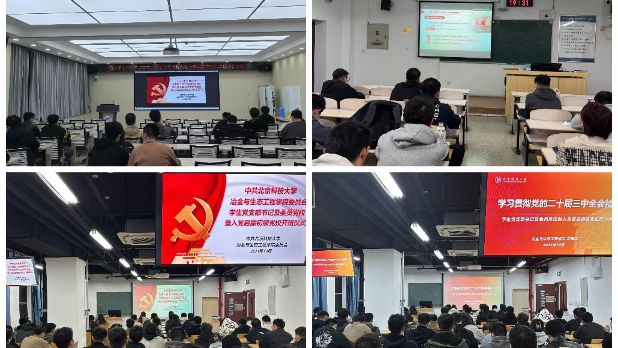 本次党校开班仪式主会场设置在冶金楼110教室,并在冶金楼206、冶金楼210、冶金楼616、昌平校区S302设置了4个分会场,参与学员包括冶金党委全体学生党支部书记及委员、2024级新生及往届申请入党学生,共计400余人共同参会。