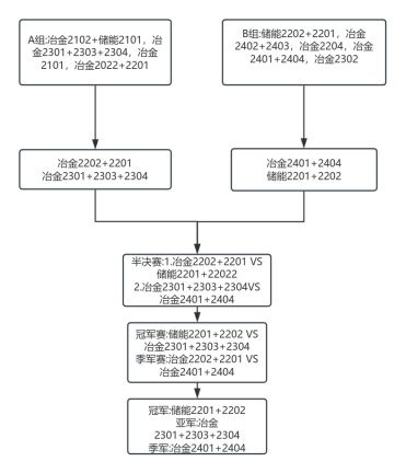 经过激烈的角逐后,2025年4月22日,在H动画 篮球场14号、15号场地,终于迎来激动人心的决赛。冶金2301+2303+2304联队、冶金2401+2404联队、储能2201+2202联队、冶金2201+2202联队成功杀入决赛。