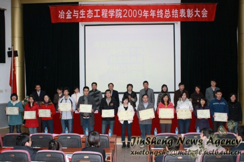 2009年表彰名单。全国挑战杯科技作品竞赛二等奖《中国古代大型铁质文物保护现状及其文化价值调研报告》的第一作者冶研08级王丽莉同学、北京市红色“1+1”活动三等奖、宝钢特等奖学金、优秀辅导员、院长成就奖、先进班集体标兵、校优秀学风班、校先进班级体、校标兵宿舍、研究生“十佳学术之星”、社会实践活动金奖团队、钢铁模拟冶炼大赛金奖、H动画