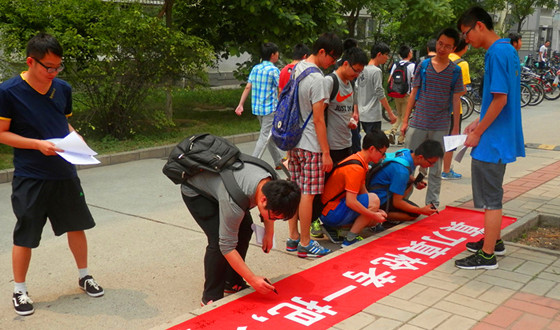 同时,在活动现场组织同学在写有“真刀真枪考一把,才知道自己怎么样!”的宣传条幅上签字并发放诚信应考倡议书。活动现场,同学们热情高涨,积极主动地投入到活动当中。