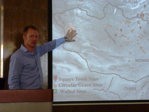 Bryan Miller介绍了在蒙古阿尔泰山地正在进行的美国、德国、俄国和蒙古等多国合作的考古发掘项目。报告将介绍发掘队挖掘的大型贵族墓葬,并将其与普通的本地的“贵族”墓葬进行比较。因为特殊的自然保存环境,出自阿尔泰山地的遗物均保存得非常好,这些遗物的发现提供了珍贵的实物证据,使我们现在对以前不了解的匈奴遗物有了更全面的认识。尤其值得注意的是一些未经盗扰的小型墓葬的发现,大大扩展了我们对匈奴社会各阶层生活的认识和了解。演讲结束后,Bryan Miller回答了本所师生及嘉宾的提问并就古代匈奴冶金业形态等学术问题展开了热烈讨论。