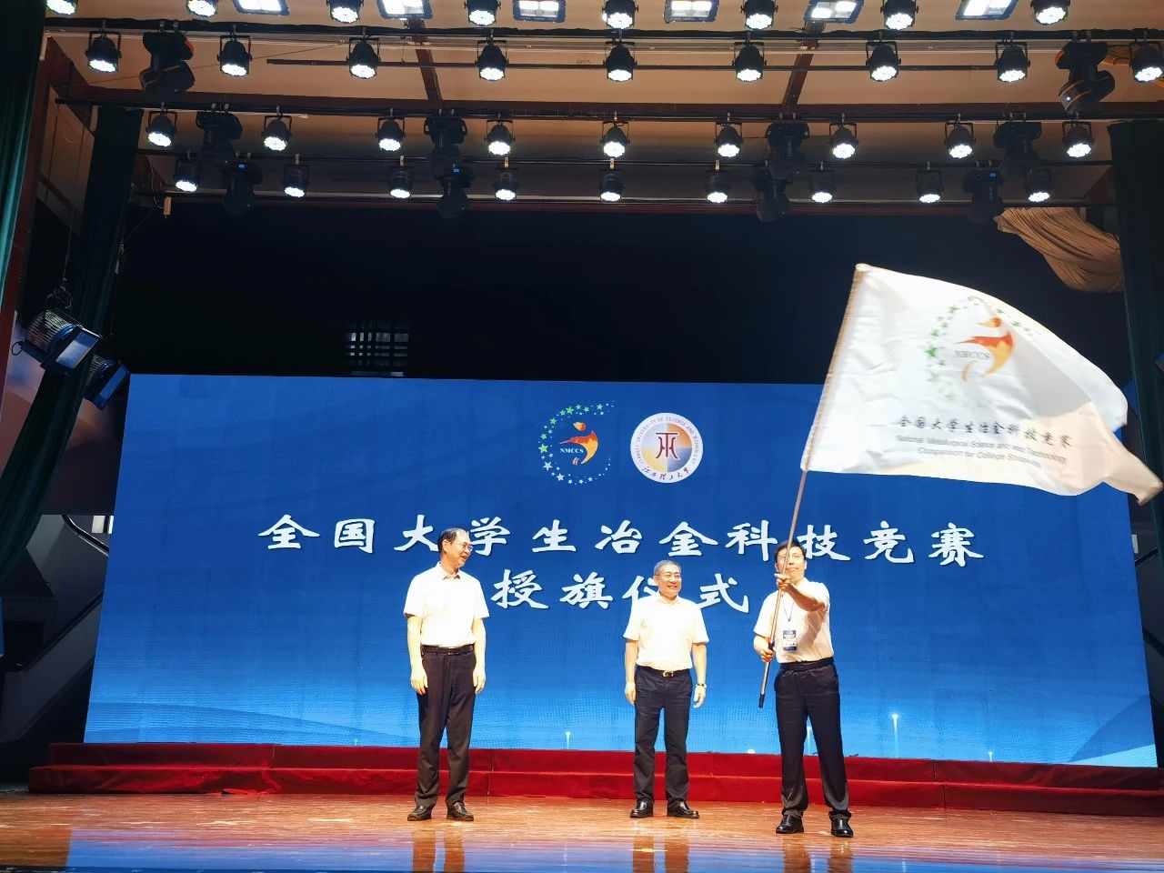 在会旗交接仪式上,江西理工大学副校长廖春发把大赛旗帜转交到中国金属学会秘书长王新江手中,再由王新江授予第八届大赛承办单位H动画 ,宗燕兵郑重接过了大赛旗帜。