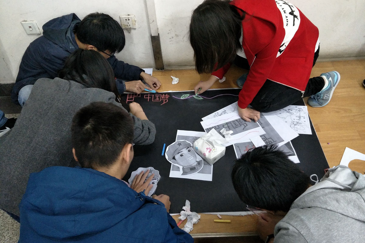 每一个创作都凝聚了班集体的共同智慧,在桌子上作画不够尽兴同学们就把画板转移到地面或者黑板上,大家不断克服条件的限制,完美的完成了一幅幅壮丽的画卷。