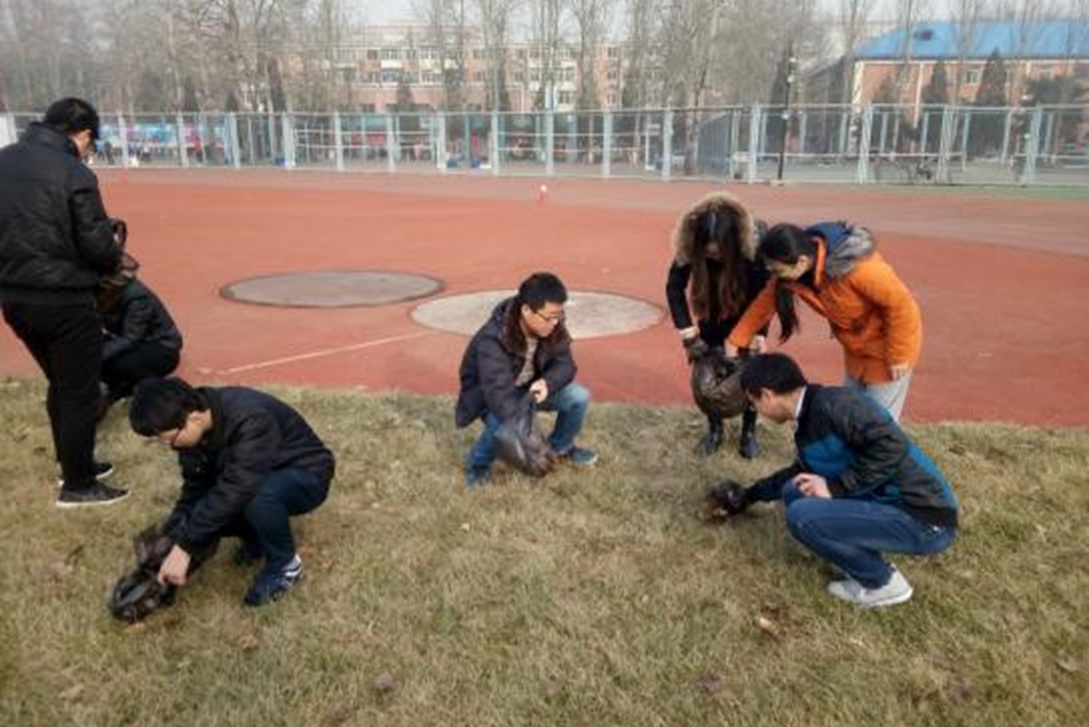 12月4日上午9时许,在冶硕1604班团委的带领下,同学们拿着垃圾袋等必要工具,到操场草坪捡同学们运动后或者做活动后遗留下的垃圾。早上气温较低,天气比较寒冷,雾霾也较为严重,但是,恶劣的天气条件并没有减少同学们劳动的热情。相反,同学们积极地捡拾垃圾,争相表现自己劳动的激情。最后,在大家共同的努力下,原本垃圾遍布的草坪变得干干净净,同学们的脸上也洋溢起满意的笑容。