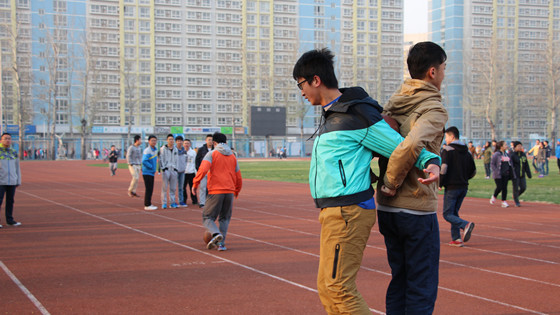 本科2014级利用早操时间开展素质拓展活动。素质拓展活动主要由“坐地起身”与“背夹球”两个项目组成。