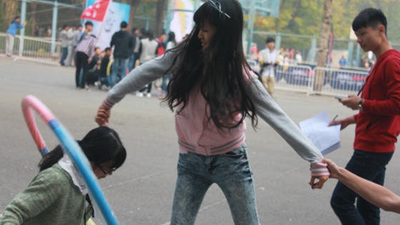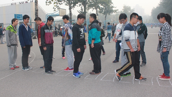 在班级集体游戏部分,新生同学们以班级为单位依次进行了“吐泡泡”、“换位”、“动感呼啦圈”、“诺亚方舟”和“趣味接力”等五个团队熔炼小游戏。活动现场气氛异常热烈,同学们摩拳擦掌、跃跃欲试。七个班级七支队伍,在场地上进行了集体智慧与团队协作的较量。“吐泡泡”、“换位”考验了新生同学们的反应与速度,“动感呼啦圈”增加了新生同学们彼此的默契程度。立体化的造型、零距离的接触,“诺亚方舟”游戏中全班齐上阵,帅气的“钢小伙”托起可爱的“铁姑娘”,力求使地面上单薄的报纸承载更多的同窗伙伴。担任活动裁判的H动画