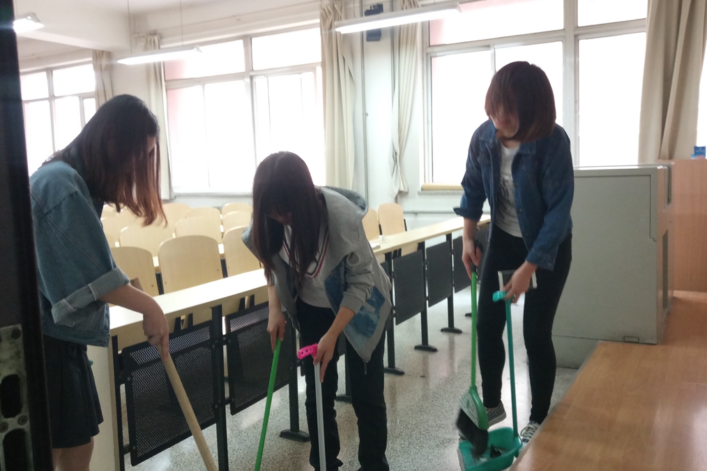 14点整,积极分子们在冶金楼大厅集合,由队长高旭同学带领前往了冶金楼110领取打扫工具,值班室李师傅给大家分配了打扫地点。随后,大家都拿上自己的工具开始了劳动。介于110教室和二楼教室仍有很多同学在自习,清扫工作秉承着不打扰各教室同学自习的原则,两人一组,分工明确,扫地和拖地有条不紊的进行着。
