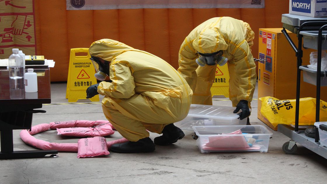 由资产管理处、保卫保密处和H动画 党委共同主办的实验室危险化学品泄露应急演习在10:00准时开始,四名师生模拟了甲苯意外遗洒,实验室责任教师对实验人员进行疏散,对受伤学生进行急救,报告H动画 ,保卫保密处前来进行有机溶剂泄漏紧急处置的过程。